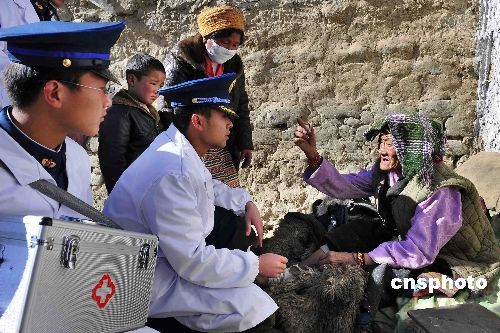 圖為醫療小分隊成員深入藏族同胞家中,為行動不便的病人診治。中新社發 郭超英 攝