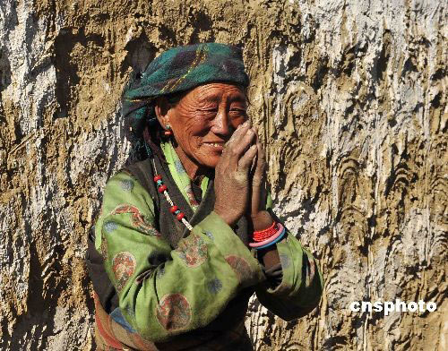 藏歷新年即將到來之際(2月25日為藏歷大年初一),駐藏空軍部隊醫務人員深入農戶義務巡診。圖為老阿媽一直把官兵們送到大門外,不停地說:“謝謝親人金珠瑪米(解放軍)。中新社發 郭超英 攝