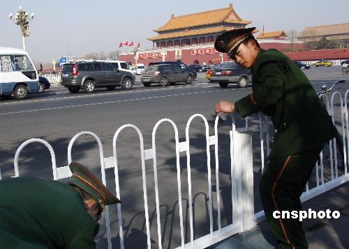2月27日,全國“兩會”即將召開,北京天安門廣場進行全面清潔整理工作,以迎接“兩會”開幕。中新社發 鄭雄增 攝