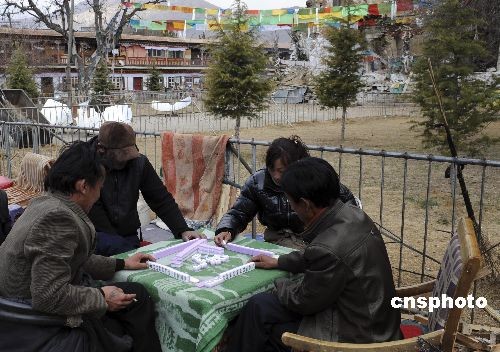 2月28日,拉薩市東城策門林藏民聚居區(qū),社區(qū)居民搭起桌子在室外打麻將休閑。中新社發(fā) 廖攀 攝