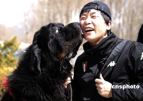 2009年初春,中新社特派記者一行到西藏藏獒協會養殖基地采訪,《中國新聞周刊》記者劉震被喜馬拉雅河谷型藏獒口水四濺地熱吻,逗得大家啼笑皆非。中新社發 廖攀 攝