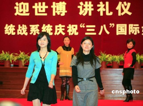 3月4日,上海統戰系統女公務員歡聚一堂,穿戴自己最靚麗的時裝,登臺展示禮儀和風采。據悉,這是該機關舉行“迎世博、講禮儀、展風采、慶祝三八婦女節”活動之一。中新社發 潘索菲 攝