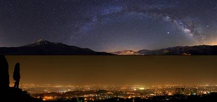 “夜空下的世界”項目的另外一重要目標,就是提醒人類注意城市燈光污染。現在城市明亮的燈光已讓人們很難看到夜空中的星星。本圖上半部分的弧形,其實就是伊朗北部上空的銀河,而下半部分則是燈光污染的德黑蘭。耀眼的燈光在照亮世界的同時也帶來了燈光污染,太亮的燈光可能導致居民無法安睡、司機駕車炫目等。對天文學家和天文愛好者來說,眾多的強亮光還嚴重影響他們觀測星空。世界多個國家已經開始與燈光污染作斗爭,比如在一些新開發的地區,要求安裝不正對空中的燈光裝置,鼓勵夜晚照明燈光全部射向地面。
