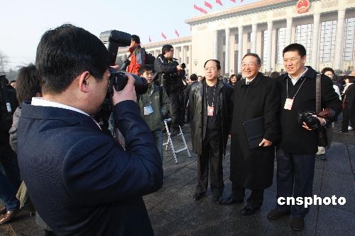 3月5日,第十一屆全國人大二次會議開幕會在北京人民大會堂隆重舉行。圖為人大代表柳傳志在會前與記者合影。 中新社發 李松 攝