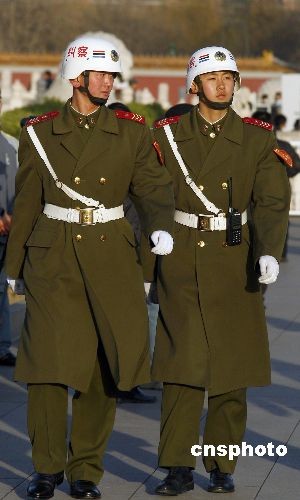 3月5日,中國軍隊(duì)糾察士兵在北京天安門廣場(chǎng)檢查軍容軍紀(jì)。中新社發(fā) 鄭雄增 攝