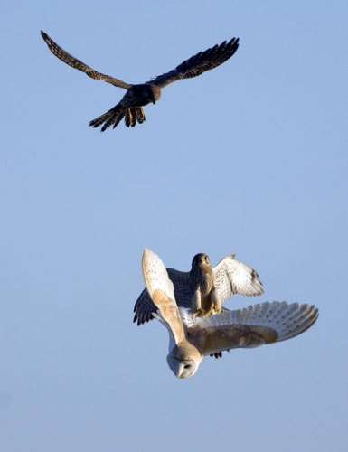 猛禽“空戰”。圖為一只谷倉貓頭鷹在白天覓食時遭到兩只茶隼的伏擊的照片。