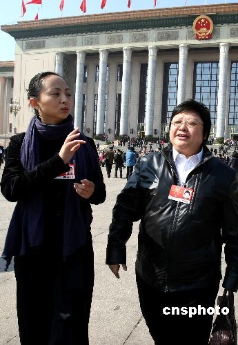 3月8日,全國政協十一屆二次會議舉行第三次全體會議。圖為“千手觀音”邰麗華與歌星韓紅在會議結束后一起步出大會堂。中新社發 傅丹丹 攝