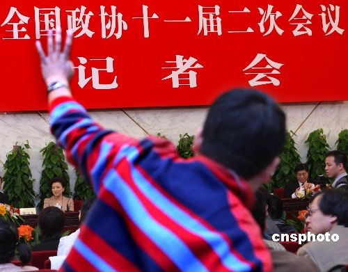 全國政協十一屆二次會議3月8日就2010年5月上海舉辦世界博覽會舉行記者會,香港大公報記者踴躍提問。萬季飛、周漢民、成岳沖、楊瀾等四位全國政協委員回答了籌備中的上海世界博覽會資金來源,籌備進度情況,外界關注的美國、臺灣參展情況,金融危機的影響及民營企業參展情況等問題。與會中外記者表現出極大關注,爭相提問。中新社發 宋吉河 攝
