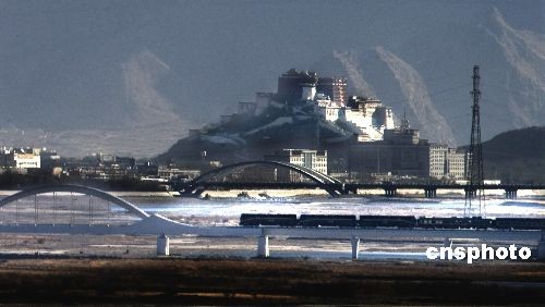 3月9日,青藏鐵路上的列車駛過拉薩城西側(cè)的拉薩河大橋。據(jù)悉,有關(guān)方面爭取今年“五一”前開行青藏鐵路五星級(jí)豪華列車。目前,已經(jīng)有不少旅行社聯(lián)系青藏鐵路五星級(jí)列車,客源情況很好。中新社發(fā) 廖攀 攝