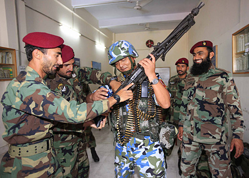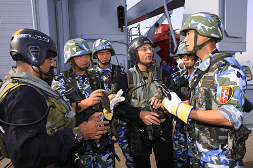 中國海軍特戰隊員(中)參加“和平—09”多國海上聯合軍演時與巴基斯坦海軍特戰隊員交流。