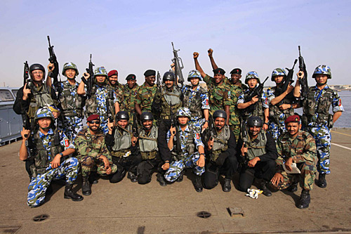 中國海軍特戰隊員、巴基斯坦海軍特戰隊員和尼日利亞海軍特戰隊員在海上直升機滑降演習現場合影。查春明 攝