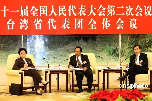 3月9日,全國人大臺灣省代表團(tuán)在人民大會堂舉行全體會議,審議全國人大常委會委員長吳邦國全國人大常委會工作報告。圖為全國臺聯(lián)會長梁國揚代表(中),全國臺聯(lián)理事魏麗惠(左)和臺盟中央副主席陳蔚文出席會議。中新社發(fā) 杜洋 攝