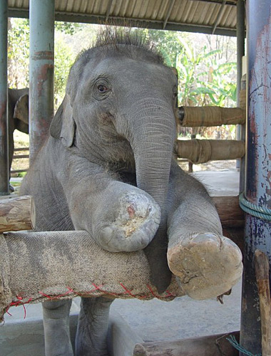 據(jù)悉,這只亞洲象名叫摩薩,當(dāng)前已有3歲大。2007年不幸踩到地雷后,前右腿慘遭炸毀,醫(yī)生為其實施了緊急救治,并為其安裝假肢。摩薩目前已經(jīng)逐步適應(yīng)假肢,不久將會重返一個亞熱帶叢林。