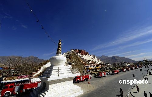 3月10日,西藏公安消防特種裝備車輛駛過布達(dá)拉宮廣場。當(dāng)日,西藏公安消防特種裝備車輛服役儀式在拉薩市舉行,26輛消防車輛在市區(qū)主要街道進(jìn)行拉動(dòng)演練。中新社發(fā) 廖攀 攝