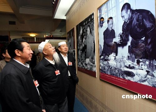 3月11日,參加全國政協會議的回族委員參觀在北京民族宮舉辦的西藏民主改革50年大型展覽。墻上照片為1959年時任國務院副總理的鄧小平與班禪大師在一起。中新社發 傅丹丹 攝
