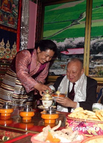 3月11日,參加“兩會”的全國政協副主席董建華,前往北京民族文化宮參觀“西藏民主改革50年展覽”。圖為董建華在參觀時感受藏族民俗。中新社發(fā) 張宇 攝