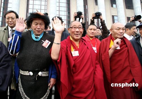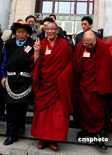 3月12日,全國(guó)政協(xié)十一屆二次會(huì)議閉幕。圖為來自西藏的宗教界委員阿旺吉卓(中)走出會(huì)場(chǎng)。中新社發(fā) 傅丹丹 攝