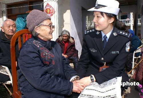 為傳達(dá)貫徹全國“兩會”精神,3月10日,河南商丘公安局交警支隊一大隊的警花們帶著宣傳資料來到轄區(qū)第一老年公寓,以多種形式向老人宣傳全國“兩會”精神。圖為警花和老人在聊天。中新社發(fā) 白項林 攝