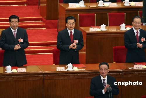 3月13日,第十一屆全國人民代表大會第二次會議在北京人民大會堂舉行閉幕會,表決通過各項決議。胡錦濤、吳邦國、溫家寶、賈慶林出席大會。中新社發 盛佳鵬 攝