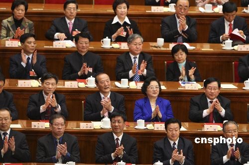 3月13日,第十一屆全國人民代表大會第二次會議在北京人民大會堂舉行閉幕會,全國人大代表鼓掌慶祝通過各項決議。中新社發 盛佳鵬 攝