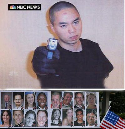 這張美國(guó)全國(guó)廣播公司2007年4月18日晚間新聞的電視截圖顯示,弗吉尼亞理工大學(xué)槍擊案兇手、韓國(guó)籍學(xué)生趙承熙擺出持槍射擊的姿勢(shì)。趙承熙16日在作案間隙曾向美國(guó)全國(guó)廣播公司寄過(guò)一個(gè)包裹,里面包括錄像帶和照片,錄像中有不少攻擊和謾罵“富人”的內(nèi)容。趙承熙在弗吉尼亞州一所大學(xué)兩個(gè)多小時(shí)內(nèi)兩度開(kāi)槍行兇,造成33人死亡,20多人受傷,兇案震驚全球。