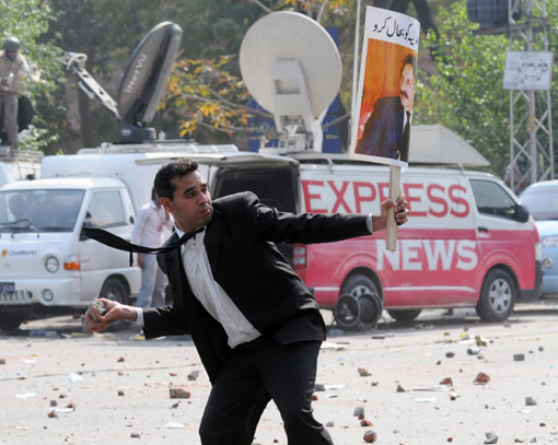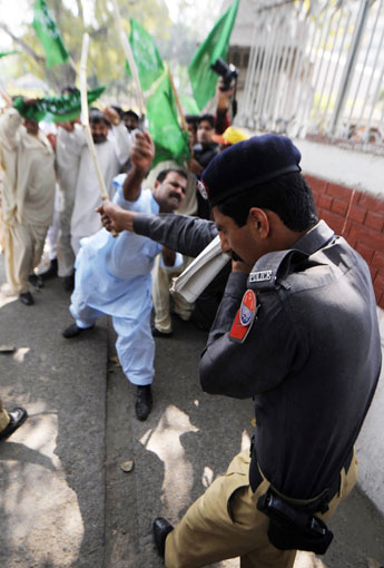 3月15日,巴基斯坦前總理謝里夫的支持者在拉合爾舉行抗議集會(huì)時(shí)與警察發(fā)生沖突。