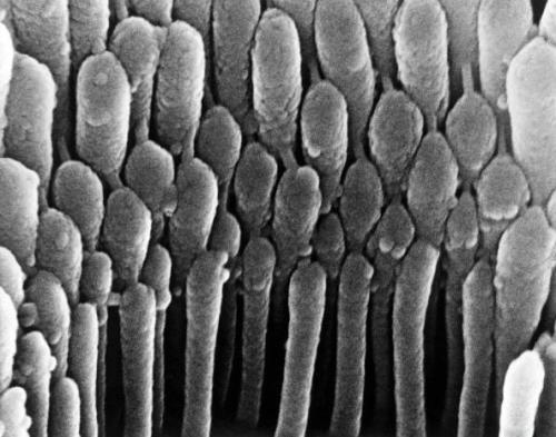 耳毛細胞:這張圖片看起來好像是在耳朵里面對耳毛細胞進行近距離觀察時拍攝的。耳毛細胞的主要功能是發現對聲震作出反應時產生的機械運動。