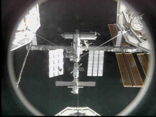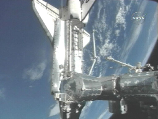 圖為美國國家航空和航天局發布的“發現”號與國際空間站對接電視截圖。