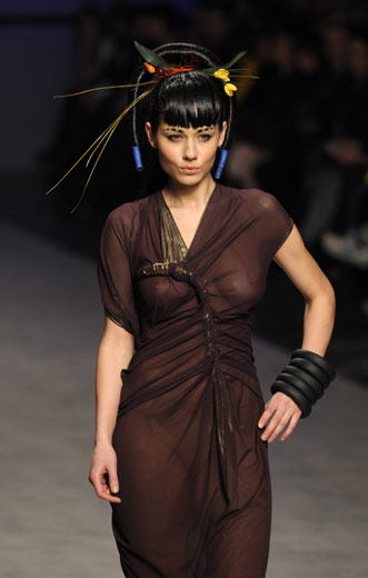3月16日,模特在烏克蘭首都基輔舉行的時裝周上展示造型奇麗的發(fā)型設(shè)計。
