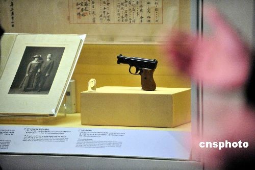 圖為毛瑟手槍(復制品),是孫中山于一九一五年送給宋慶齡的結婚禮物;及孫中山和宋慶齡結婚照(復制品)。中新社發 譚達明 攝