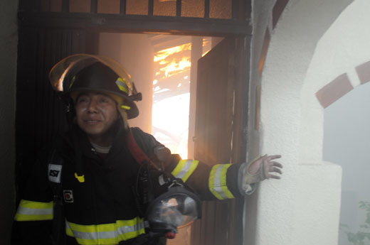 消防隊員進(jìn)入火場施救。