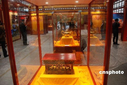 為期五天的“雪域風情——藏族非物質文化遺產精粹展”三月二十日下午在澳門綜藝館開幕,展出了十世班禪獻給中央人民政府的木桌(圖中)等珍貴文物。圖為開幕前工作人員在作最后準備。中新社發 畢永光 攝