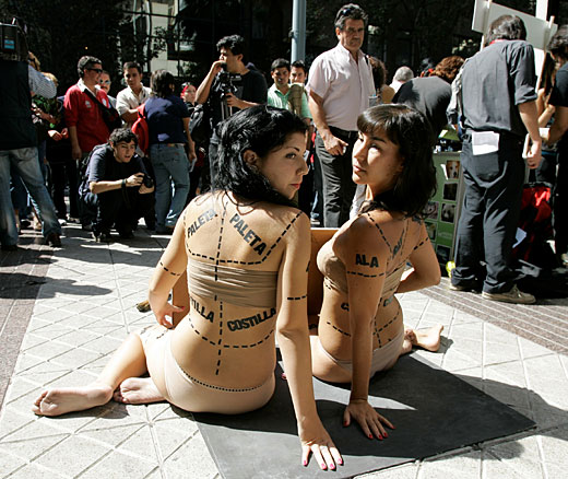 當(dāng)?shù)貢r(shí)間3月19日,來自AnimaNaturalis動(dòng)物保護(hù)組織的智利美女在首都圣地亞哥舉辦了一場(chǎng)別出心裁的“裸身切割”活動(dòng),呼吁民眾保護(hù)動(dòng)物。