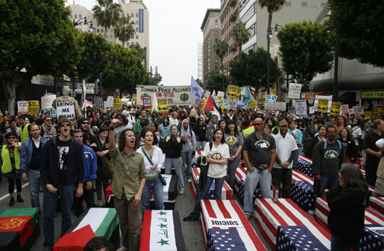 當地時間21日,美國數千名反戰人士聚集在洛杉磯,舉行反戰游行示威活動,紀念伊拉克戰爭爆發六周年,要求美國政府立即從伊拉克和阿富汗撤軍。