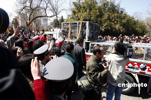 3月22日,在京生活了9個(gè)月的8只奧運(yùn)大熊貓開(kāi)始起程返回四川老家,北京動(dòng)物園特地舉辦了“奧運(yùn)熊貓返川儀式”,吸引萬(wàn)名觀眾前來(lái)依依惜別。中新社發(fā) 鄭雄增 攝