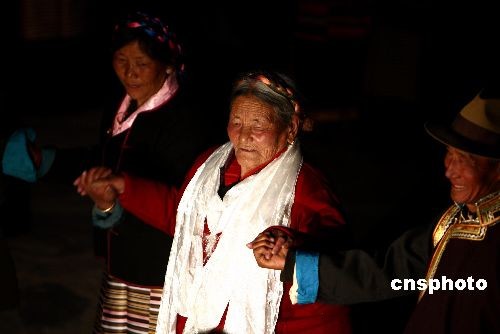 3月23日晚,西藏山南地區結巴鄉結巴村的村民自發組織篝火晚會,喜迎西藏百萬農奴解放日。結巴鄉是西藏第一個“朗生互助組”的誕生地。西藏實行民主改革后,廣大農奴獲得了解放,自己當家做主,并擁有了土地。圖為83歲高齡的次仁拉姆(左)表示:百萬農奴解放紀念日是山南地區農民最吉祥和最幸福的一天。1959年西藏山南地區實行民主改革以后,結巴村被解放的農奴和朗生們自主地組織成立了第一個“朗生互助組”,而當年倡議成立互助組并任組長的就是次仁拉姆。中新社發 杜洋 攝