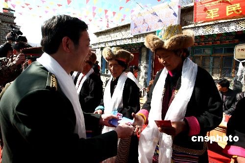 3月24日,在“西藏百萬農奴解放紀念日”即將來臨時,作為西藏民主改革第一村的西藏山南地區乃東縣昌珠鎮克松村與西藏山南軍分區某部一起舉行“軍民共建小康示范村”揭牌儀式,此后,克松村民的基礎設施建設、教育、醫療等各方面都將得到解放軍更多的幫助。揭牌儀式上,15戶貧困村民得到了免費醫療卡,300多人得到了醫療優惠卡,生病的村民將在離村子僅5公里的解放軍41醫院得到最好的治療。中新社發 杜洋 攝