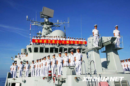 “廣州”號導彈驅逐艦跨越祖國傳統(tǒng)海疆線,回到祖國懷抱,艦上全體官兵在南海舉行回歸祖國儀式。