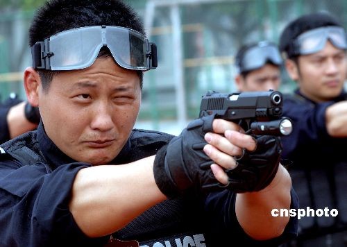 一名持槍特警在福建警察學院戰術系教官指導下進行模擬處置突發事件練兵。中新社發 劉可耕 攝