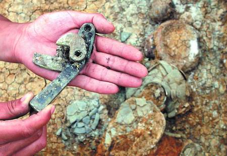 記者還在現場看到一個銅質弩機殘件。周科華告訴記者,弩機是射箭的工具,為戰國晚期器物,可能是目前發現的最早的銅質弩機,考古價值極大。另外,還有鐵劍、鐵斧、蒜頭壺、陶罐、陶俑等也較有特色。
