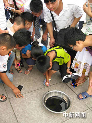 記者在觀測現場看到,一些天文愛好者早已架起了專業的望遠鏡;而許多市民則走起“平民路線”,戴起墨色眼鏡或黑色遮光玻璃片擋住太陽光,以便更清晰地看清日食;更有“經驗老道”的市民,在臉盆里倒上墨汁,觀看太陽的倒影,平添了幾分傳統神秘色彩,引來了無數的圍觀者。
