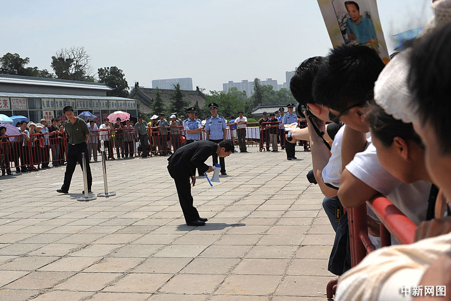 羅京治喪委員會(huì)新聞發(fā)言人郎永淳鞠躬答謝群眾。中新網(wǎng)記者 金碩 攝