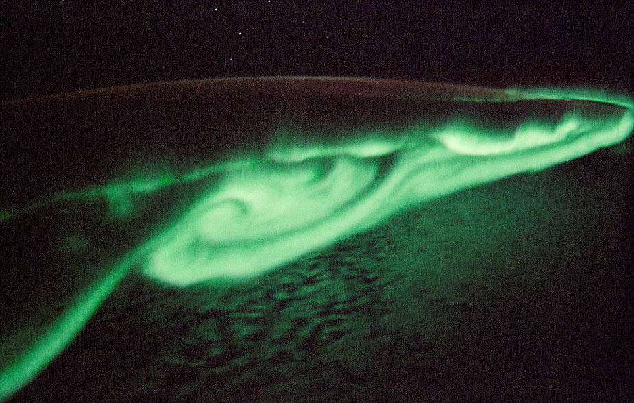 在兩極上空大氣層以上數(shù)十公里的太空,極光現(xiàn)象仍能被清楚地觀測到。紅色、綠色的極光閃爍著怪異的微弱綠光,好似鬼怪之光,給人以寒冷的感覺。在繞地軌道上的宇航員用長曝光相機(jī)和35毫米膠片拍攝下了這些怪異的圖片。