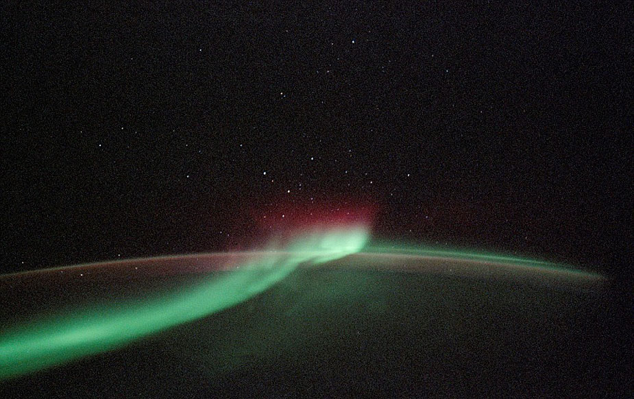 在兩極上空大氣層以上數十公里的太空,極光現象仍能被清楚地觀測到。紅色、綠色的極光閃爍著怪異的微弱綠光,好似鬼怪之光,給人以寒冷的感覺。在繞地軌道上的宇航員用長曝光相機和35毫米膠片拍攝下了這些怪異的圖片。