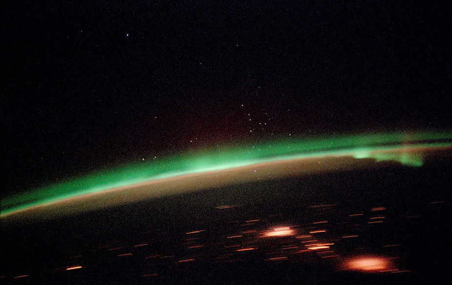 在兩極上空大氣層以上數(shù)十公里的太空,極光現(xiàn)象仍能被清楚地觀測(cè)到。紅色、綠色的極光閃爍著怪異的微弱綠光,好似鬼怪之光,給人以寒冷的感覺(jué)。在繞地軌道上的宇航員用長(zhǎng)曝光相機(jī)和35毫米膠片拍攝下了這些怪異的圖片。
