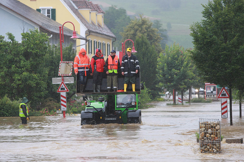 6月24日,奧地利部分地區由于連日降雨發生洪災。當地消防人員緊急出動,用各種工具將災民運往安全地帶。