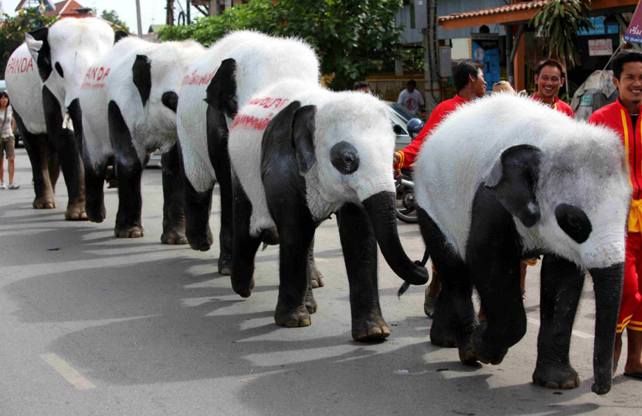 據英國媒體報道,近日,泰國因一只剛出生的熊貓陷入熱潮,泰國還準備向公眾征集熊貓幼崽的名字。幾只大象也“妝扮”成熊貓的模樣,借此吸引人們的關注。