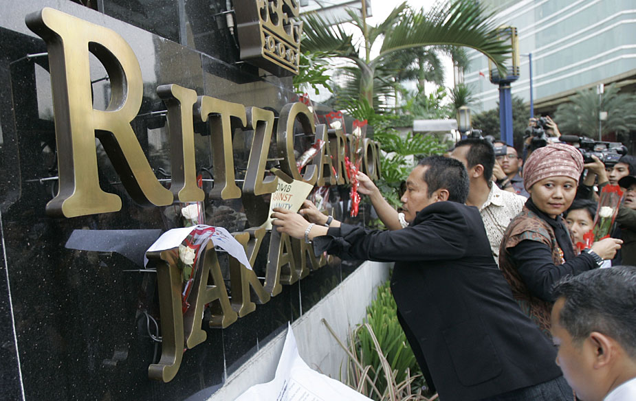 7月18日,印度尼西亞首都雅加達的民眾紛紛來到發生爆炸的萬豪酒店和麗嘉酒店,向死難者獻花表示哀悼。