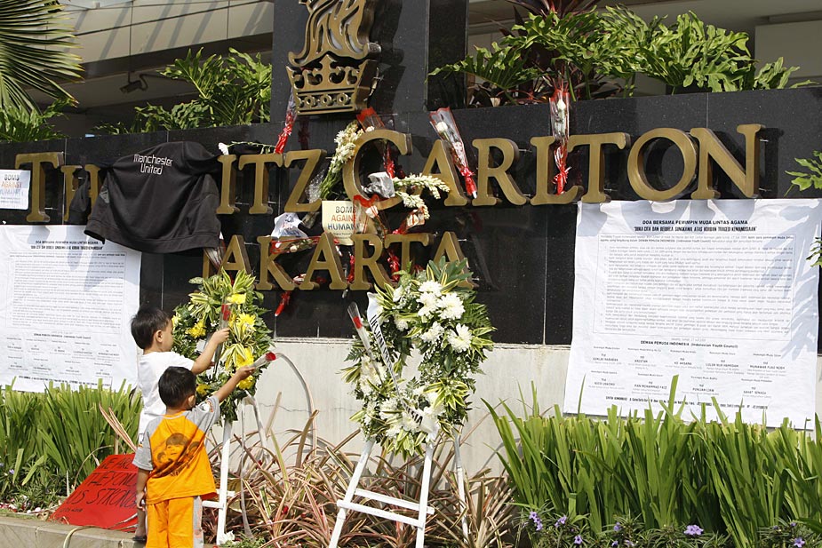 7月18日,印度尼西亞首都雅加達的民眾紛紛來到發生爆炸的萬豪酒店和麗嘉酒店,向死難者獻花表示哀悼。