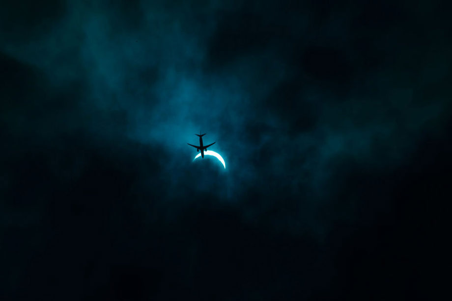 2009年7月22日上午9點20分左右,武漢出現日全食,恰逢客機穿越。dannier zheng/CFP